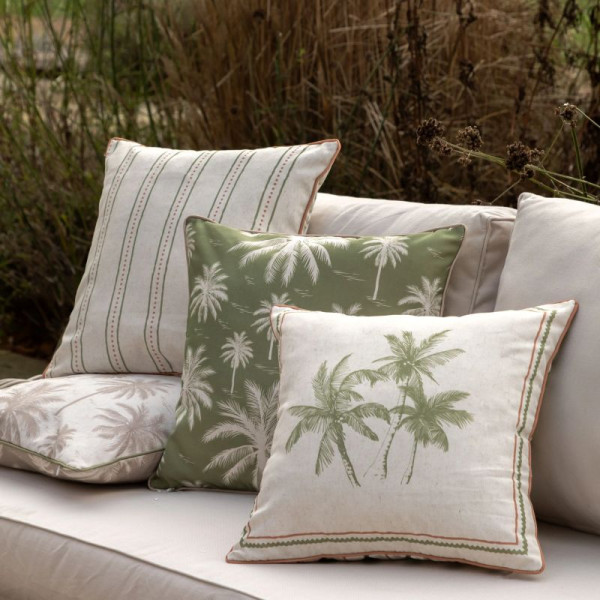 Bring a relaxed, holiday inspired feel to your outdoor space with the Palmera Cushion Natural. Featuring a subtle palm tree print in soft green tones against a neutral background, this cushion effortlessly captures a laid-back, tropical aesthetic, perfect for patios, garden seating, or conservatories.Crafted from durable polyester and printed on showerproof fabric, the Palmera Cushion is made with outdoor living in mind. It’s ideal for those spontaneous moments outside, morning coffee, sunny afternoons, or evening gatherings, while still offering a soft, comfortable feel.