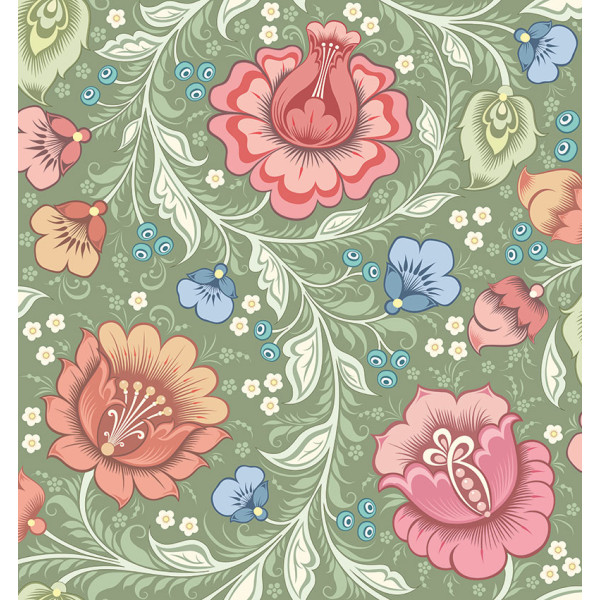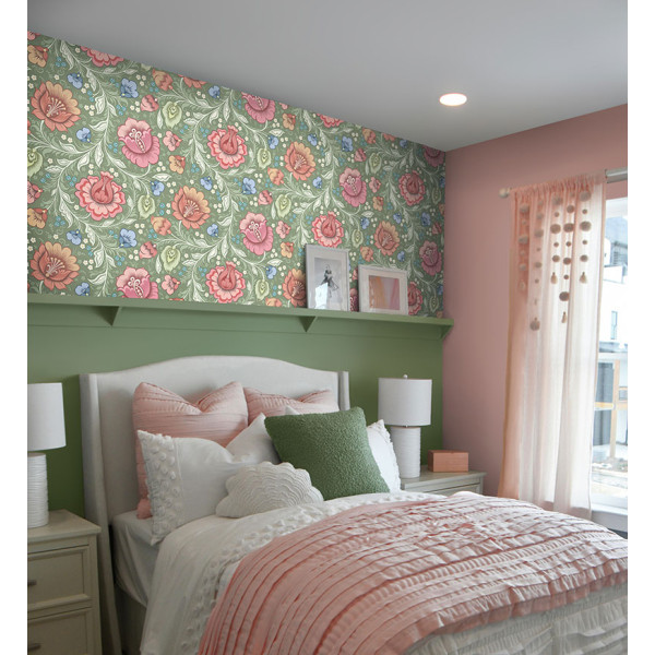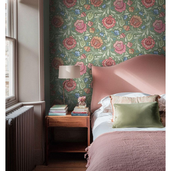 Juliette Green features a soft sage green background layered with flowing stems and curving leaves in warm, muted greens. Three large statement flowers in soft pink with subtle red accents sit alongside smaller blooms in terracotta, blush, delicate white florals, and tiny blue flowers.The folk-inspired decorative style gives the design a handcrafted, heritage feel, while the rhythmic movement of the stems creates a balanced and harmonious flow across the wall. The green backdrop enhances the botanical character, adding richness while maintaining a calm, inviting presence.