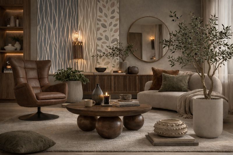 Texture replaces heavy prints in 2026 interior trends. Layer: