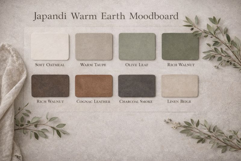 Japandi interiors in 2026 focus on clay browns, caramel, sand, mushroom, olive green and muted gold accents. Swap harsh contrasts for layered tones like warm ivory walls, walnut wood furniture and tan leather seating.