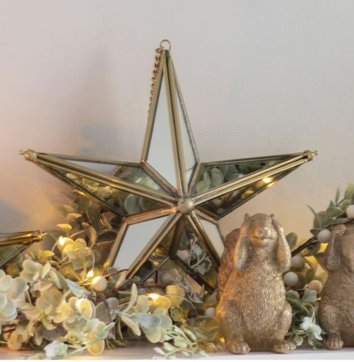 Continuing with AW2020’s interior design theme of looking to nature, we’ve been using feather décor a lot in the last few weeks. Our favourite feather flourishes are the feather wreath and matching feather Christmas tree. They are the perfect way to dress your dining room for Christmas 2020. Mood lighting and hurricane jars are another incredible way to create a festive ambience in your dining room. It is arguably the most important room to decorate for Christmas as it is where the main event, Christmas Dinner, is held, so it should not be overlooked. A focal point in a dining room, like a fireplace, is a wonderful asset when it comes to decorating the room. Of course, particular attention should be paid to the dining table, but the fireplace can be used to create a really spectacular impression. Our Vienna Hanging Mirrored Star looks exceptional on a fireplace mantlepiece surrounded by garlands of ivy or eucalyptus and large candles or fairy lights.