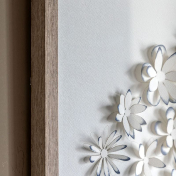 Each delicate flower is subtly raised, giving the artwork a sculptural, almost handcrafted feel. The neutral white tones paired with the soft grey frame make it incredibly easy to style, perfect for modern, coastal, Scandi or classic interiors alike. Whether it’s hanging above a sofa, in a hallway, bedroom or dining space, it adds interest while keeping the overall look calm and considered.