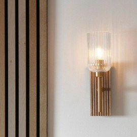 Elevate your interior with the Grove Wall Light in Dark Beechwood and Vintage Brass, a refined blend of natural texture and timeless metallic detail. Designed for modern homes that value warmth and character, this wall light pairs a grooved walnut-stained wooden backplate with a sleek brass-toned arm and a beautifully curved clear ribbed glass shade.
