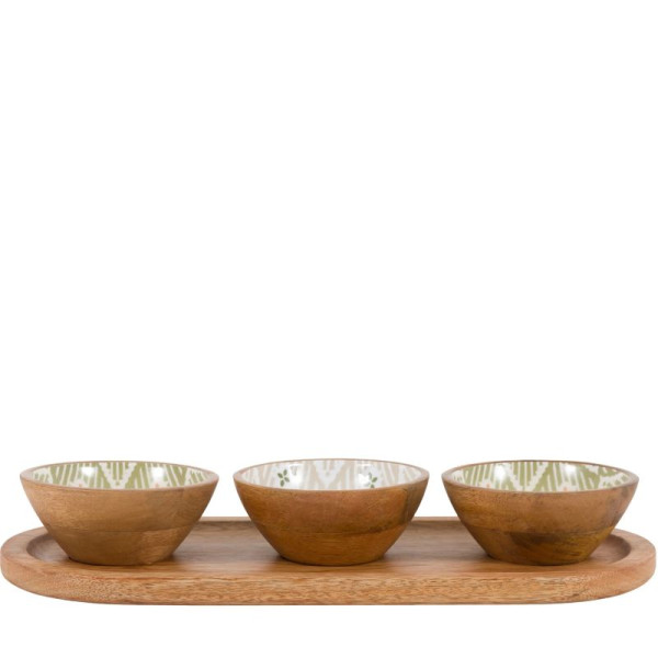 Each bowl is perfectly sized for small bites, and the included tray keeps everything organised and easy to carry from kitchen to table. It’s one of those pieces you’ll reach for again and again, both for its function and its look. The natural mango wood exterior brings warmth to your table, while the green Aztec-inspired interior adds a subtle pop of pattern that feels fresh and modern.
